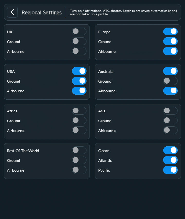 You can adjust which regions you hear ATC background chatter. You can choose from the likes of the United States, the United Kingdom, Europe, and beyond. Equally, you can toggle the Ground or Air specific ATC chatter to your liking. You can also toggle on/off different oceanic ATC recordings.